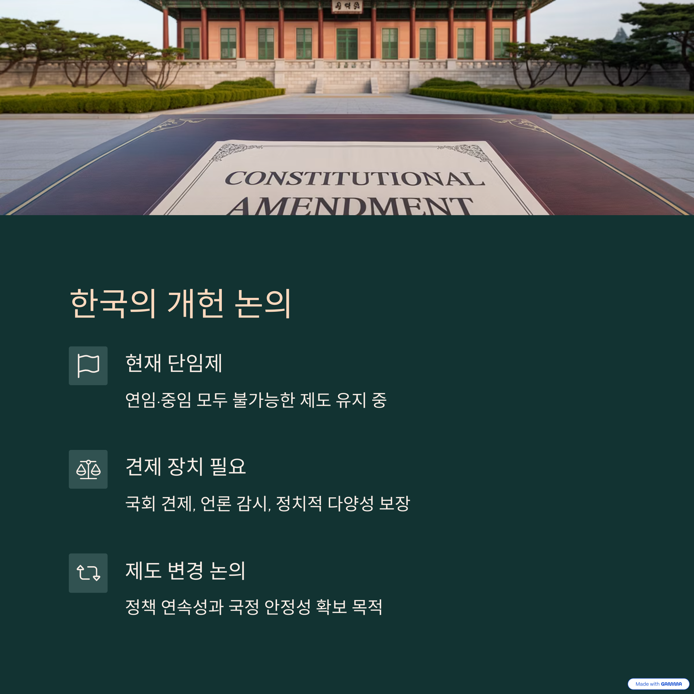 한국은 현재 대통령 단임제를 채택하고 있습니다. 하지만 정책의 연속성과 국정 안정성 확보를 위해 연임제 또는 중임제로의 개헌이 꾸준히 논의되고 있습니다.