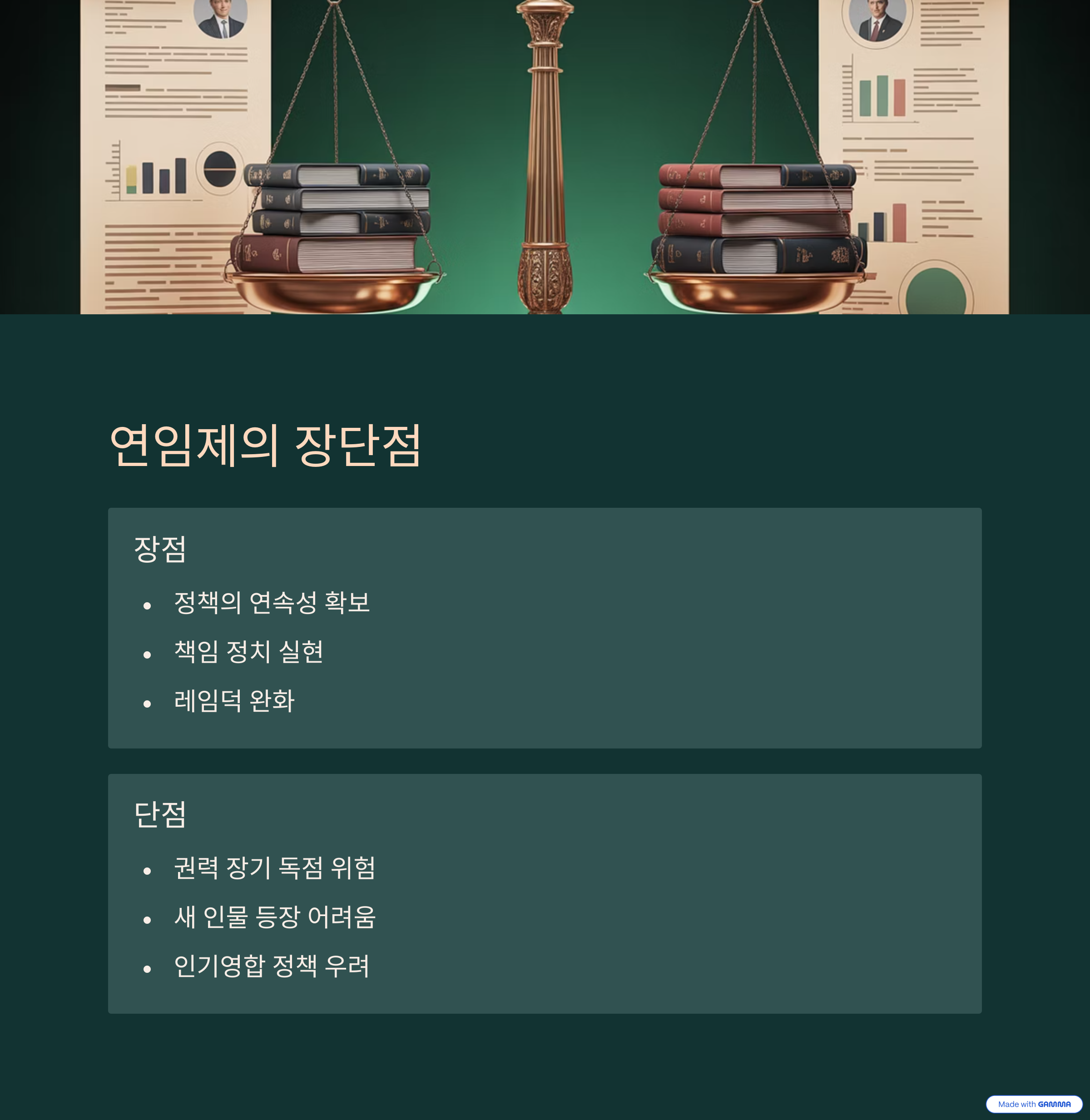 | 단점 | 권력 집중, 인물 고착화 | 정책 단절, 정치 불안정 가능 |