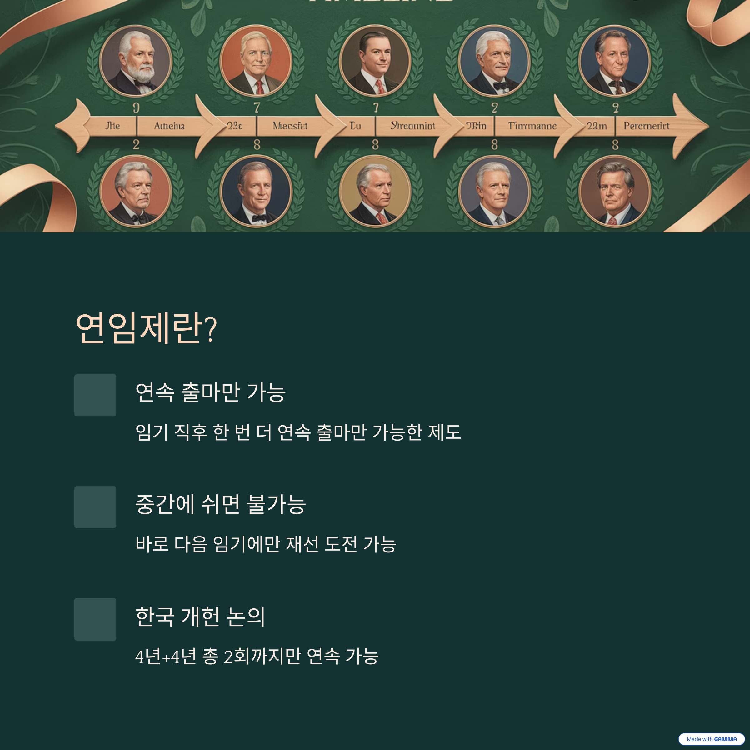 연임제는 대통령이 임기를 마친 직후에 한 번 더 연속 출마가 가능한 제도입니다. 중요한 건 ‘연속’이라는 조건입니다.