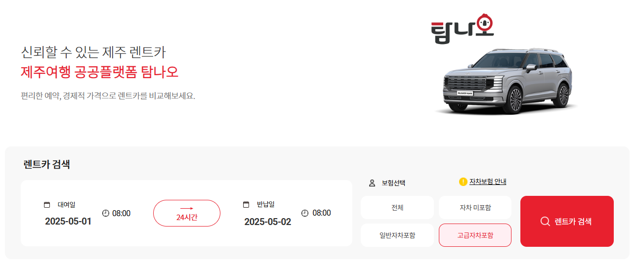 탐나오는 제주도와 관광협회가 직접 운영하는 공공 렌트카 플랫폼이에요.처음 봤을 땐 ‘공공 플랫폼이라 괜찮을까?’ 했는데, 써보니까 사기 걱정이 거의 없는 점에서 큰 장점이더라고요. 예약 안정성이 진짜 높아요.
